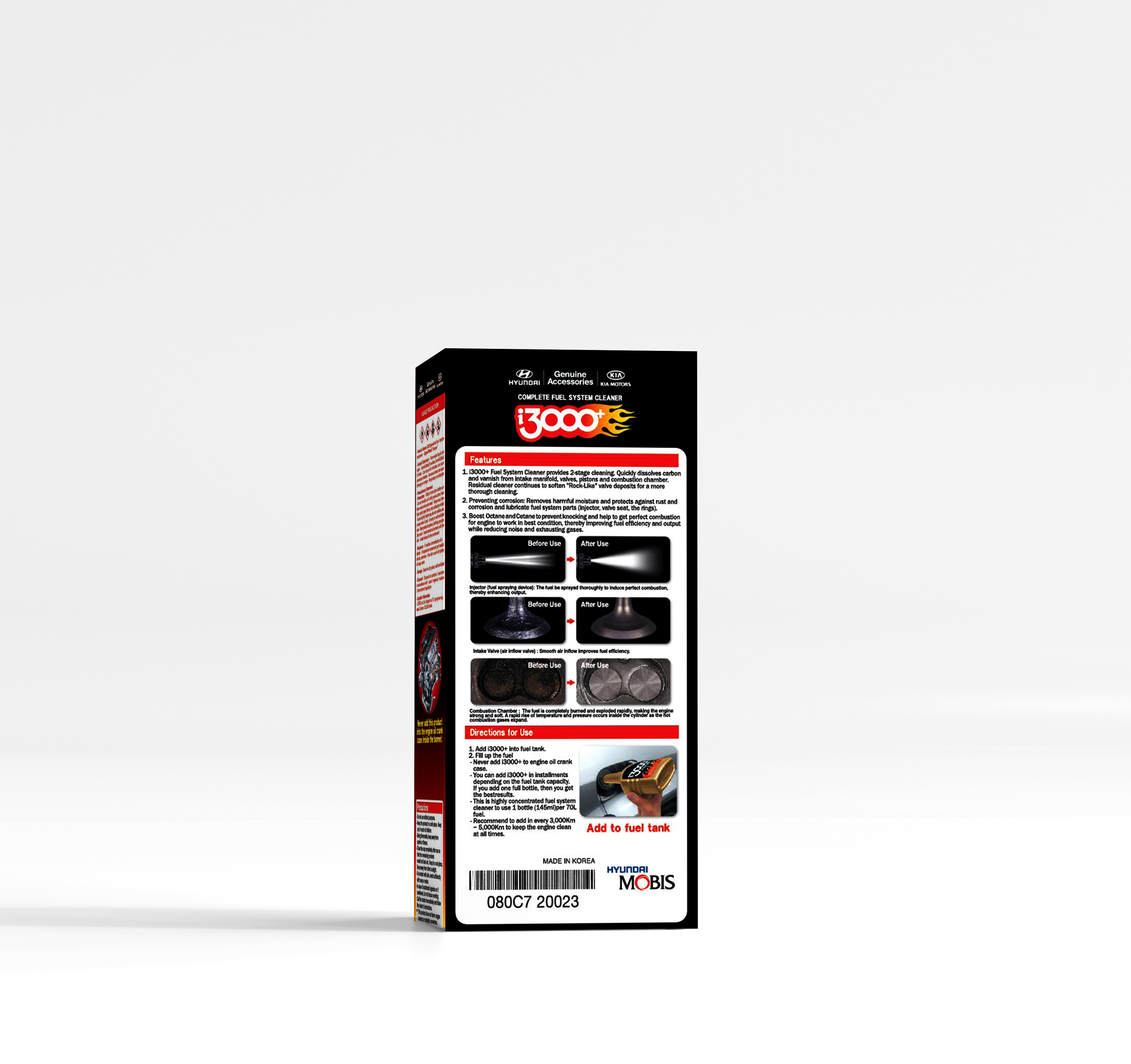 Mobis i3000 (for Gasoline Engine) is an advanced fuel system cleaner that cleans the internal engine to improve the state of the engine to that of a new engine. The Mobis i3000 improves fuel efficiency , increases mileage, reduces exhaust pollutants, restores power and performance and reduces noise-